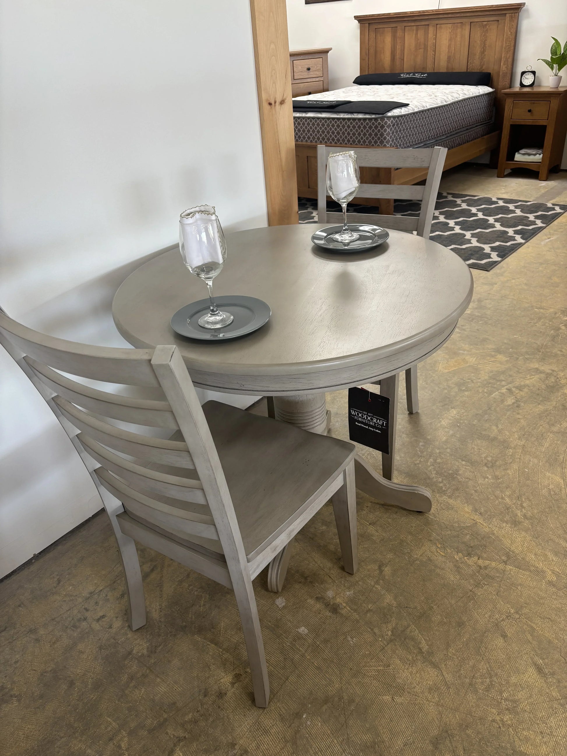 This table set is made out of solid parawood and finished in a gray finish. The dimensions are 36' round by 30' High. Table and Two Chairs.