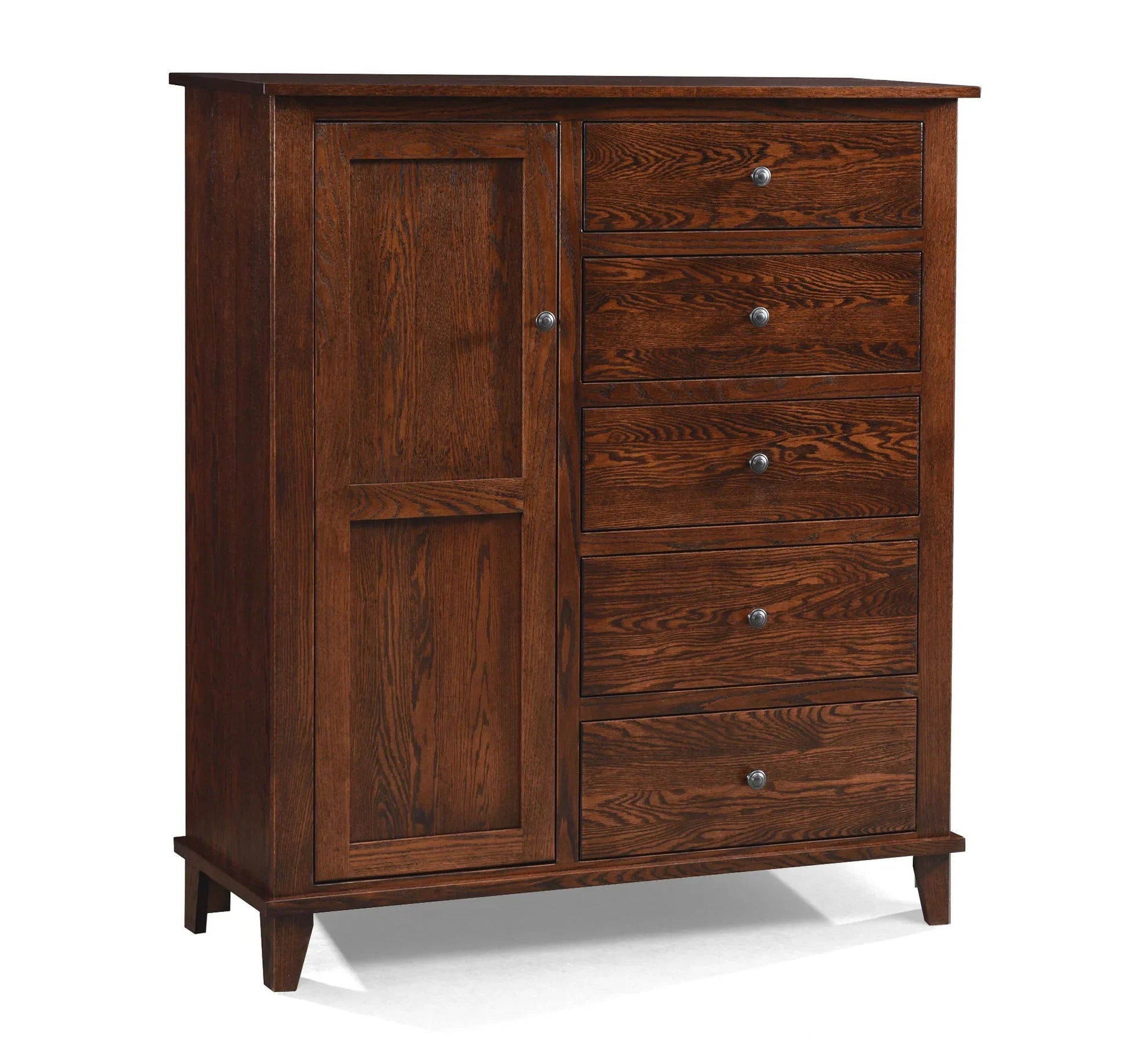 The Franklin Collection is made in Indiana out of solid oak. The drawers are dovetailed and on full extension ball-bearing slides.