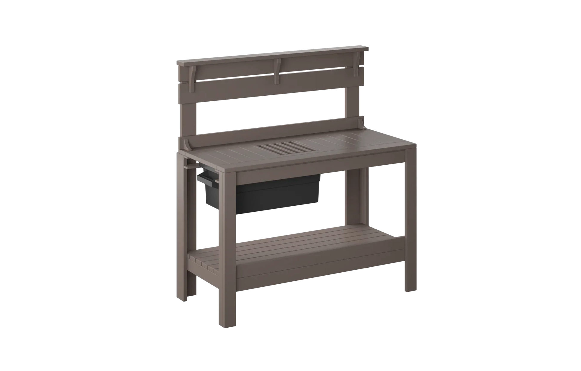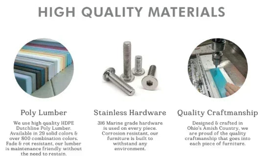 This outdoor potting bench is made from solid poly lumber. Poly furniture is an excellent choice for outdoor furniture since it simultaneously blends sustainability, style, and longevity. Poly is a long-lasting material that’s durable and resistant to natural elements and a variety of chemicals. Often, any color in poly will experience little fading because it is mixed into the plastic. Recycling is the main part of each step in creating poly. Most of what makes up poly lumber is plastic waste from bottles and bags. This keeps waste out of the oceans and landfills and reduces future plastic manufacturing. When poly lumber is cut to make poly outdoor furniture, the next batch may be made from re-melted scraps. Because of its strength and integrated pigment, high-density polyethylene is easy to maintain. Repainting decorative items is not necessary, and it is able to withstand many common sanitation methods. If you need to clean your poly item, you can use anything from dish soap and a rag to boiling water. (In extreme cases, a pressure washer is an acceptable option, too.)