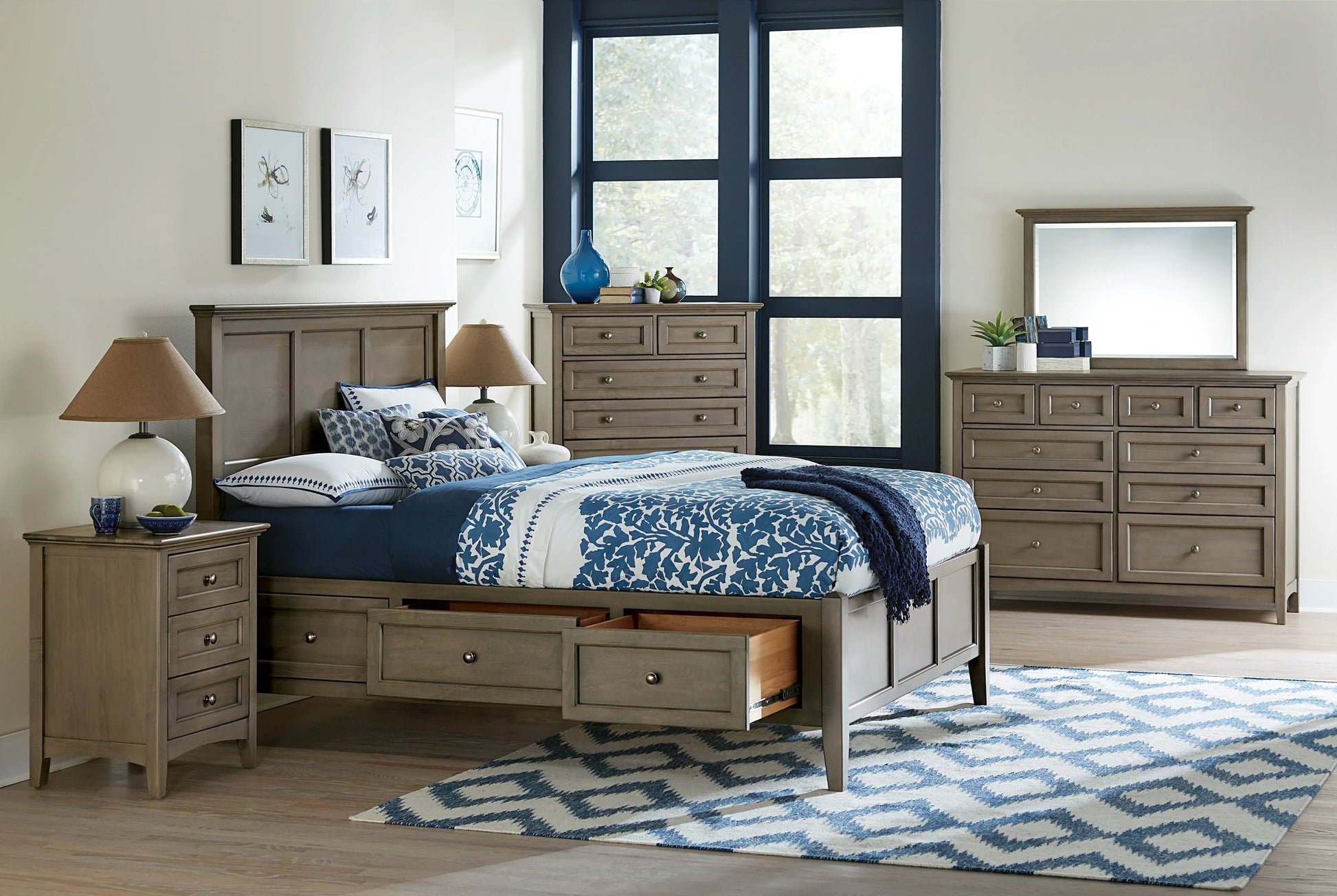 The Mckenzie Collection is constructed of American Alder and features solid alder dovetailed drawers on full-extension slides, flat panel drawer front design, levelers, anti-tipping measures, storage beds, and more. This collection is available in 3 colors only.