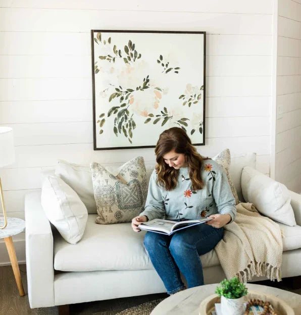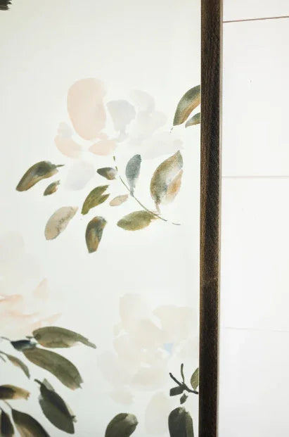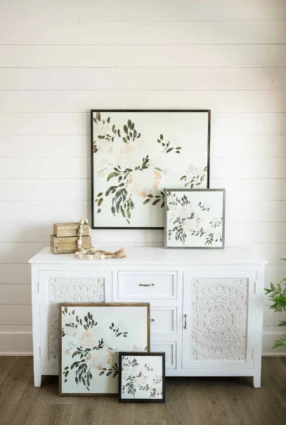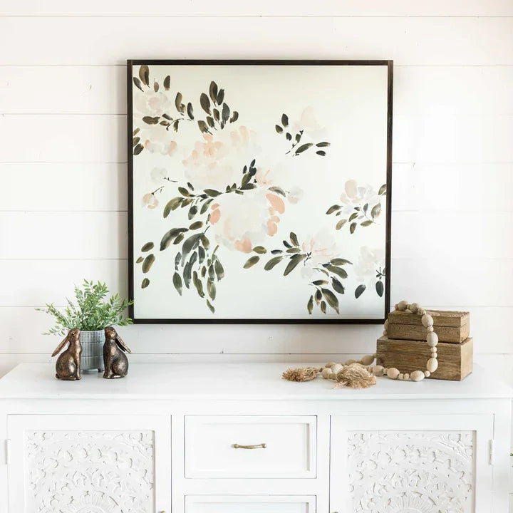 This wall art is available with a dark brown stained frame. Take Up Space features shades of cream, blush, gray, and olive coming together to create a gorgeous light, airy floral piece.